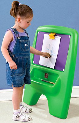 - Compact art activity center was built for toddlers with an easy-reach chalkboard